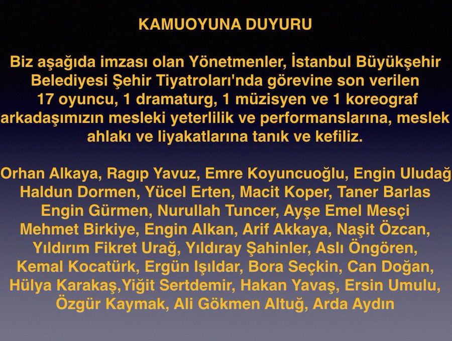 Öncelikle, dayatılan yeni yönetmeliğe karşı hukuki zeminde hakkımızı arayacağız. 100 yıllık Şehir Tiyatrosu mirasını her zeminde savunacağız. Ustalarımıza, İstanbul seyircisine ve gelecek kuşaklara karşı üstlendiğimiz bu sorumluluğu ülkemizdeki ve dünyadaki tüm sanat emekçileri ile paylaşıyoruz.